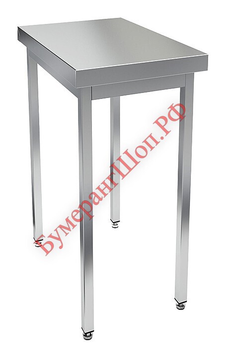 Столешница выполнена из нержавеющей стали толщиной 1 мм, усилена ребрами жесткости, опорные ножки - из трубы 40х40 мм из нержавеющей стали.