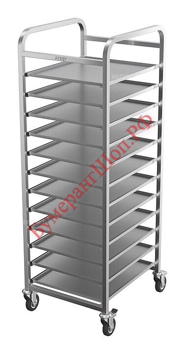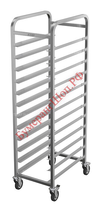 Тележка-шпилька ATESY КШ-С-1.12-470.580-02 серии Стандарт используется на предприятиях общественного питания и торговли для транспортировки и хранения противней. Модель оснащена 4 поворотными колесами, 2 из которых снабжены тормозными устройствами. Разборная конструкция полностью выполнена из нержавеющей стали AISI 304.