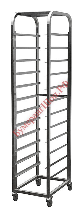 Тележка-шпилька Gastrolux Ш1-GN/12/S используется на предприятиях общественного питания и торговли, в пекарнях, кондитерских и промышленно-производственных помещениях для транспортировки противней. Каркас выполнен из гнутой трубы 25х25 из нержавеющей стали AISI 304.