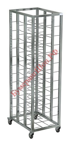 Стеллажная конструкция, рама которой изготовлена из квадратной трубы 25х25 мм, полностью выполнена из нержавеющей стали. Тележка оснащена 12 уровнями направляющих, на которых можно расположить посуду. 4 поворотных колеса, 2 из которых оснащены тормозами, позволяют легко и безопасно передвигать шпильку.