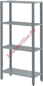 Полки и ножки с опорами регулируются по высоте. Полки усилены продольным ребром жесткости (крепится ко дну полки) для увеличения нагрузки. Конструкция разборная.