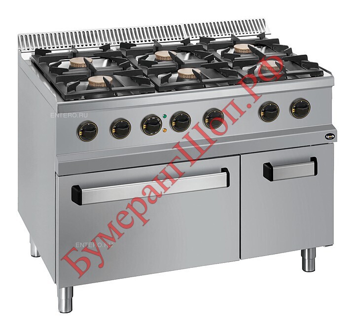 Газовая плита Apach APRG-117FE 700-й серии предназначена для приготовления различных блюд из мяса, птицы, рыбы и овощей в наплитной посуде на предприятиях общественного питания и торговли. Модель оснащена электромеханической панелью управления, гидроизолированной прессованной поверхностью и регулируемыми по высоте ножками. Корпус, рабочая поверхность, панель управления и вытяжная решетка выполнены из нержавеющей стали AISI 304, боковые и задняя панели - из нержавеющей стали AISI 430, решетки выполнены из чугуна, горелки - из эмалированного чугуна, распределительные головки - из латуни.