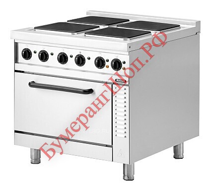 Оборудование оснащено 6-ступенчатым термостатом для регулирования температуры конфорок. Духовой шкаф оборудован направляющими для гастроемкостей размером GN 2/1, верхним и нижнем нагревом. Все поверхности имеют закругленые края, что облегчает процесс мойки. Корпус выполнен из нержавеющей стали.